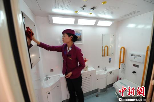 列车员对旅游列车厕所进行全天候不间断保洁。 杨艳敏 摄