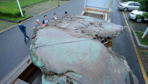 26吨世界最大自然铜,其形成可追溯到10亿年前。5月9日,工作人员正在拆除固定26吨自然铜的钢索,准备运用机械设施将其运到展区位置。