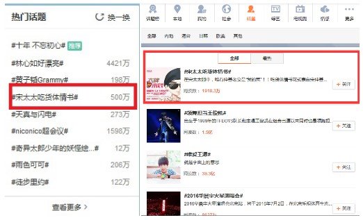 不出意外,#宋仲基吃货体情书#活动一经推出,就在“宋太太”们中间引发骚动,短时间内便连续将活动话题顶到了新浪微博话题榜。仅第一轮活动 “宋太太吃货体情书”中,话题阅读量就高达2486万,占据了微博话题总榜第三名、明星榜第一。截止发稿时,第二轮活动的数据还在不断飙升中。