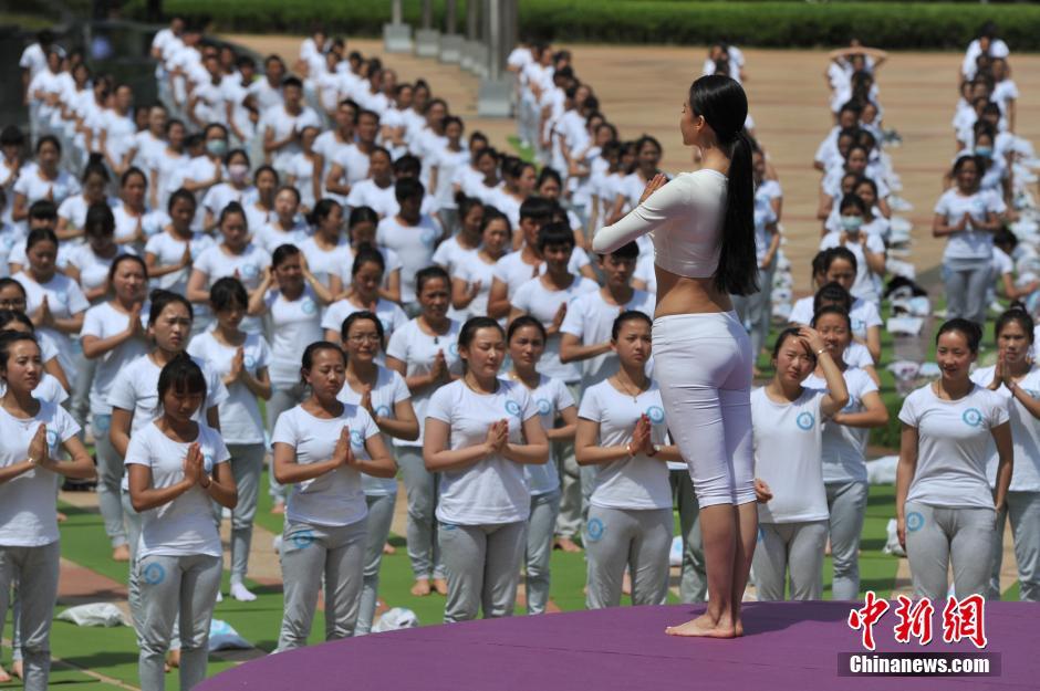 5月18日,中印瑜伽大会在昆明开幕,来自印度的瑜伽大师与中国瑜伽明星母其弥雅一起带领千名学学员做瑜伽。据了解,此次瑜伽大会为期4天,以“与世界友好相处 春天的城市 春天的瑜伽”为主题,主要包括大师瑜伽课程、瑜伽进社区、有机健康食材展等活动。图为中国瑜伽明星母其弥雅带领学员做瑜伽。中新社记者 任东 摄