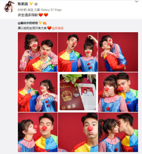 北京时间5月19日,“古装专业户”陈紫函与男友戴向宇于朝阳区民政局领证结婚。并且戴向宇和妻子陈紫函分别在微博晒出结婚证证实了这一消息,照片中二人甜蜜依偎,均一脸幸福的笑容。
