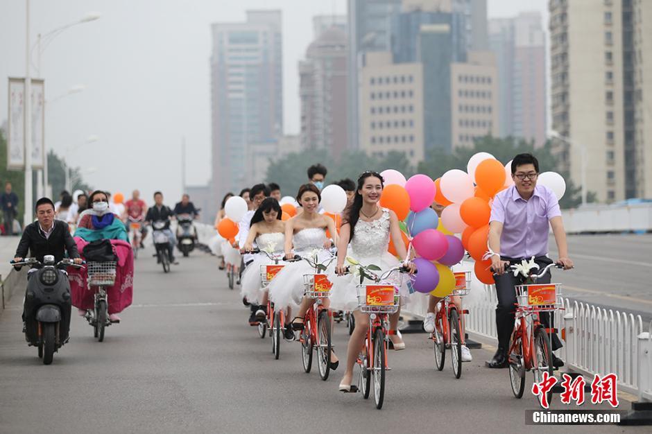 5月20日,南京90后小伙张龚亦骑着公共自行车迎接新娘徐思圆,在当地公共自行车形象大使、江苏广播主持人杨晓的策划组织下,在“520”(我爱你的谐音)这一天用绿色环保、低碳出行的方式来表达爱情,表达对生活的这座城市的热爱。泱波 摄
