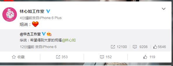 中新网5月20日电 今日,霍建华工作室官方微博发布一条消息,称“华说:希望得到大家的祝福。”并艾特了林心如。随后,林心如工作室官方微博转发微博,发表红心默认。