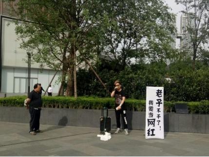 在现场只见一男子情绪激动,旁边赫然立着这副“老子不干了,我要当网红!”的醒目“标语”,以及一个移动的音响。不远处有位男子的朋友,在用手机在帮他做全程录像,中途还将手机递给IT男,让他自己对着镜头诉说。