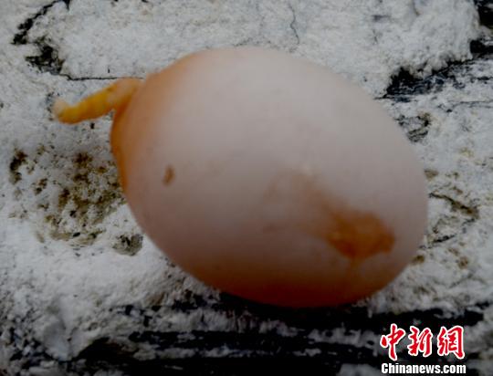 这枚鸡蛋的一端,有一段黄色的类似尾巴状物体,摸起来还有些柔软,产下这枚蛋的是一只黄色新母鸡。