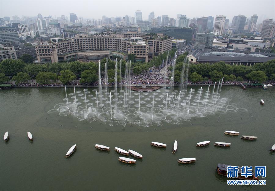 5月24日,新版杭州西湖音乐喷泉面向公众喷放。新版西湖音乐喷泉自5月23日起再度“绽放”。据介绍,经过提升改造后的喷泉每周一到周四喷放,时间为下午3点30分和4点30分,每天共计2场,每场时间10到15分钟,如遇法定节假日则暂停喷放。西湖音乐喷泉是杭州西湖的标志性文化景点,2015年10月进行了诞生13年来的最大一次提升改造,2016年5月1日重新开放。但当日因游客过多,出于安全考虑,试喷放一场后即停止。新华社记者黄宗治摄