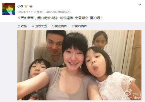中新网5月25日电 昨天傍晚,艺人小S在微博晒出自己做的菜和一张全家福。并发文:“今天的新菜,筊白笋炒肉丝,10分钟后,全盘皆空,开心喔!”