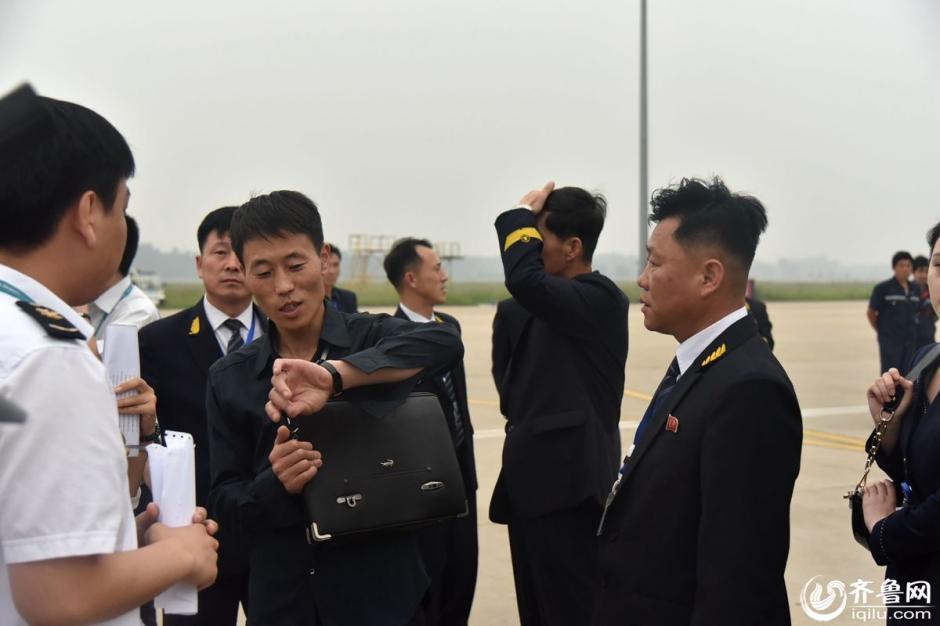 在经过严格的边防检查后,3名朝鲜空姐和7名乘务人员,他们身着统一的深蓝色空乘制服,右胸前统一佩戴着印有金日成、金正日的红色胸章,面带微笑走出机舱。(齐鲁网记者 满倩 刘玉良 摄)图片来源:齐鲁网