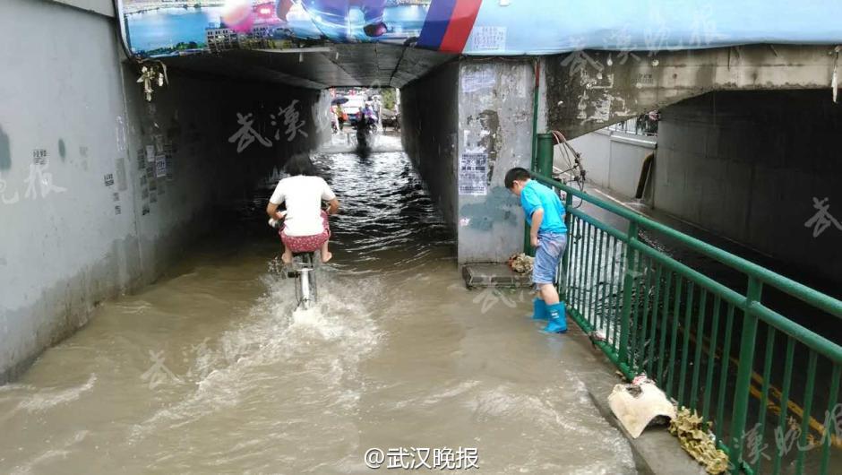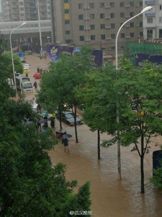 6月1日消息,从6月1日凌晨0时2分至10时5分,武汉中心气象台在10小时内发布15期暴雨预警信号,包括6期暴雨红色预警。武汉开启看海模式,多条街道被淹。图片来源:武汉晚报