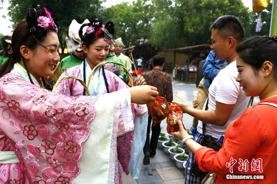 6月3日,2016中国(开封)端午文化节在清明上河园开幕,园内举行“万粽迎宾”活动,为游客发放粽子、五毒帽和香囊。图为派发香囊。 中新社记者 王中举 摄