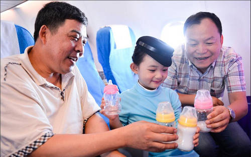 4岁超萌空姐机长机上发棒棒糖
