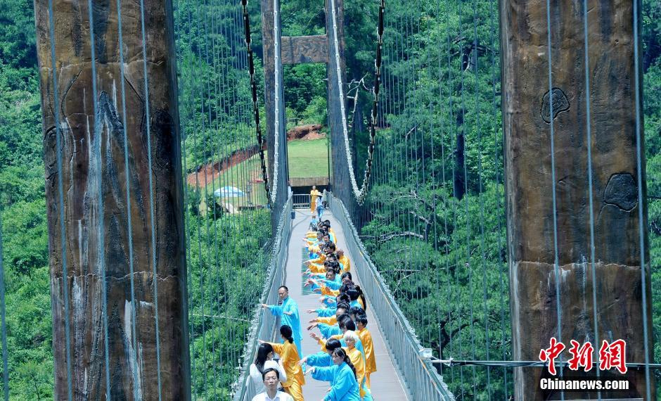 6月5日,一群来自江西省德兴市的太极拳爱好者,在婺源县篁岭景区距地面最深达110米的“天桥”上,上演空中舞太极。当天,在素有古村晒秋醉游人的江西省婺源县篁岭景区,首次观赏到演空中舞太极表演,近百名来自江西省德兴市的太极权爱好者,站在长298米、宽2.2米、距地面高达110米的高空天桥上,演绎了一场空中舞太极,展示出天人合一的壮观场景,吸引了众多游客前来观赏。据了解,这是篁岭景区针对每年的端午前后是人们养生健身的最佳时节,首次举办这项活动,旨在鼓励人们走进大自然,锻炼更健康。中新社发 卓忠伟 摄 图片来源:CNSPHOTO