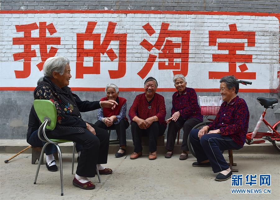几位老人坐在山西省侯马市垤上村农村淘宝服务站前聊天(6月1日摄)。垤上村农村淘宝服务站于2015年11月开业,几位老人都是店里的常客。