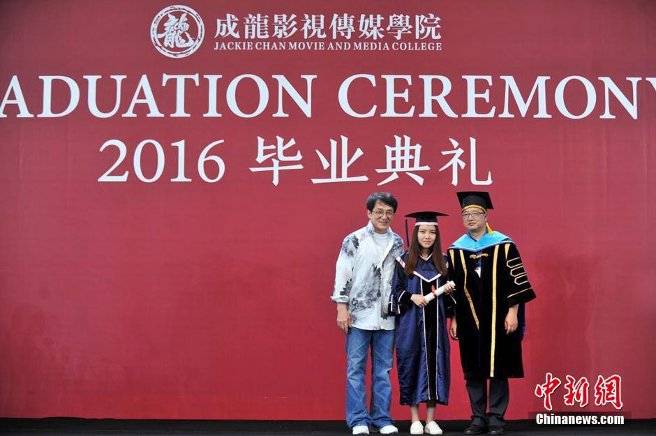 6月5日,影视明星成龙来武汉参加成龙影视传媒学院2016年毕业典礼,与学生交流分享自己的人生经验。他劝勉大学生们:“要好好学习各种技能,不要怀疑自己。希望你们任何时候都要努力学习,毕业之后也要做一个复合型人才,有目标就不要放弃。”钟欣 摄