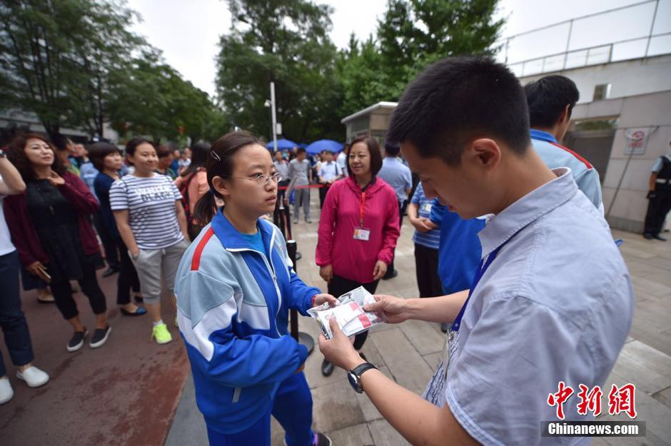 2016年6月7日,全国高考首日,在北京约6万考生将前往全市17个考区,96个考点参加此次大考。图为北京八中考点门口,考生接受检查,进场考试。 中新网记者 金硕 摄