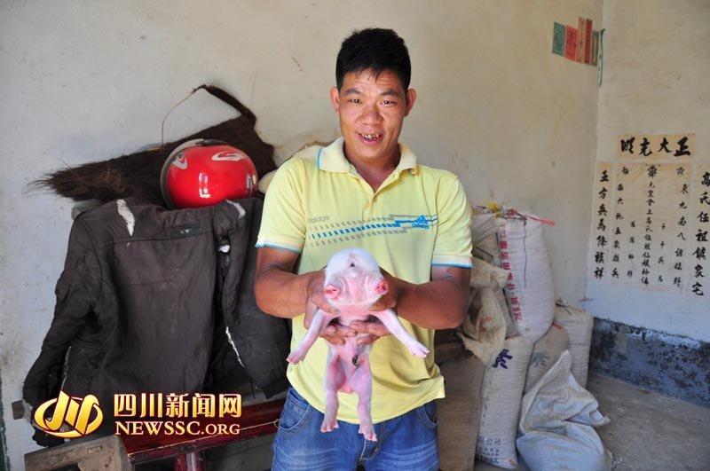 6月5日,家住四川泸州古蔺县护家镇凤田村5组村民钟国远家的一头母猪产下一只怪猪,这只小猪长了两张脸、三只眼。不到一天时间,已有上百人络绎不绝地从远近各地赶到钟国远家“看稀奇”。图为“怪猪”。
