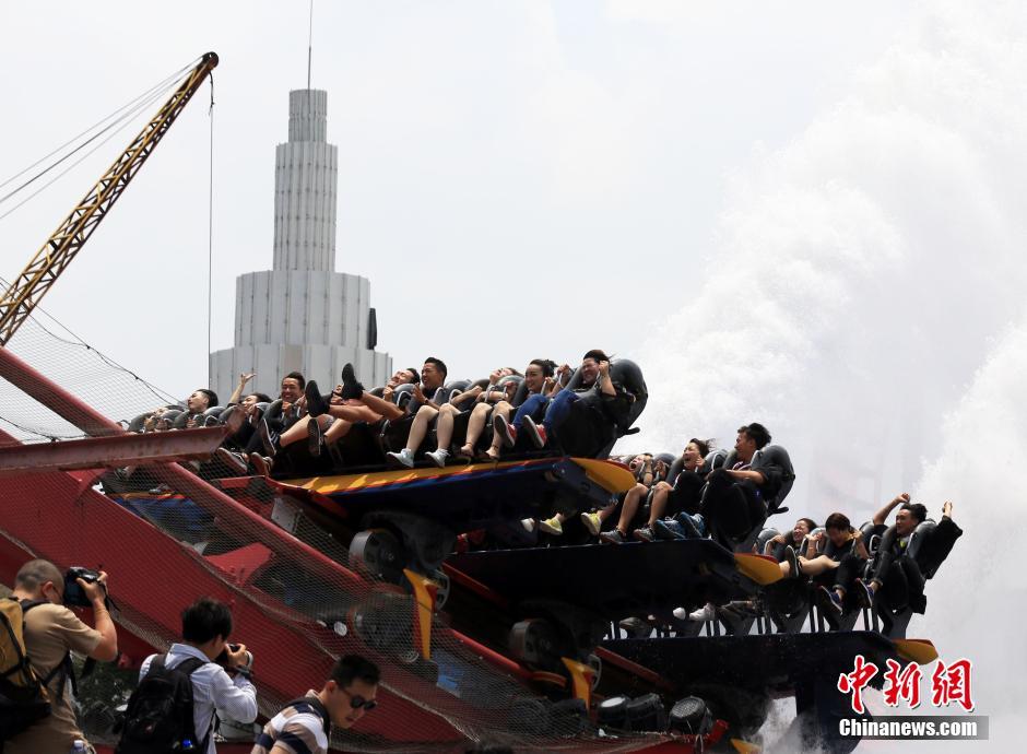 6月13日,来自上海11所高校近百名毕业生,身着学士服,集体乘上海欢乐谷“绝顶雄风”过山车,以不同寻常的惊险刺激,来纪念活力十足的青春,感受创意毕业礼。中新社记者 潘索菲 摄