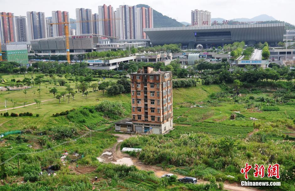 2016年6月13日,广东深圳,深圳龙华新区深圳北站附近,一栋墙体裸露红砖、显得破旧的七层小楼,孤零零地伫立在空地上,犹如一座孤岛,与远处的高楼形成巨大的反差。2011年,广深高铁开通,这栋950平米的建筑,曾被谈到2000多万的补偿款,由于屋主的拒绝,至今仍高耸至此。前不久(6月8日),龙华新区地理位置远不如此的一宗商住混合用地,成交价被拍出140.6亿元,晋升今年全国土地总价新地王。这栋犹如孤岛的七层小楼,重新回到公众的视野。图片来源:东方IC 版权作品 请勿转载