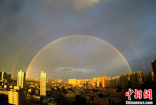 6月14日,经过一场短时暴雨后,山西太原上空出现双彩虹景观。中新社记者 韦亮 摄