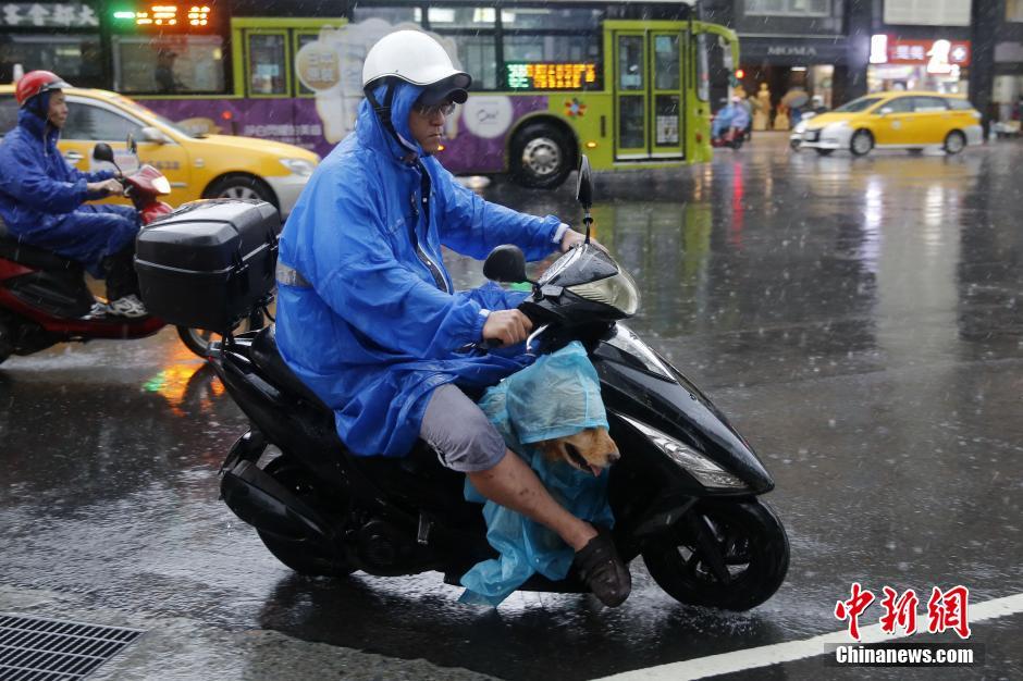 6月14日,台北市南京东路上,骑摩托车出行的民众给狗穿上雨衣。连日来,台湾多地遭遇豪雨。台农业部门14日表示,6月豪雨已累计造成全台农业产物及民间设施损失估计达1188万元新台币。中新社记者 陈小愿 摄