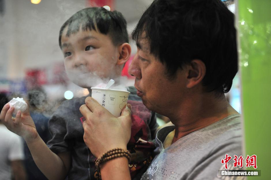 6月14日,买到冰淇淋的观众。当日,利用零下190度液氮制作的冰淇淋亮相第四届中国-南亚博览会,口鼻冒烟的独特吃法让现场众多吃货欲罢不能。中新社记者 刘冉阳 摄