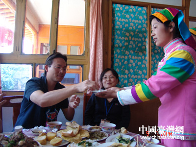 欣赏完了土族人民的精彩表演,两岸记者还到土族农家做客,品尝土族农家特色风味,两岸记者们受到了土族人民的热情接待。土族人民用土族的迎客礼仪来招待两岸记者。土族农家全家在大门口外迎接两岸记者,先献上象征吉祥如意的哈达,敬两岸记者们“进门三杯酒”,记者们进家门后,上炕入座后再敬“吉祥如意三杯酒”,招待记者的菜肴也是当地颇具代表性的农家风味,筵席结束后,主人还殷勤地为客人送上“上马三杯酒”,预祝两岸记者一路平安。两岸记者也被土族人民的热情好客深深感动。(谢晓萍)