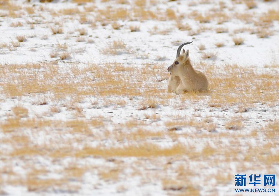 一只藏原羚在藏北高原的雪地上休憩(1月16日摄)。新华社记者 张汝锋 摄