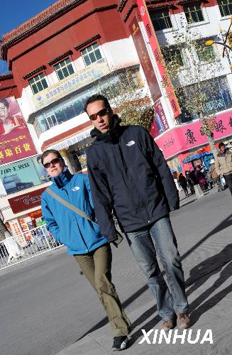 12月4日,两名外国游客在拉萨街头漫步。