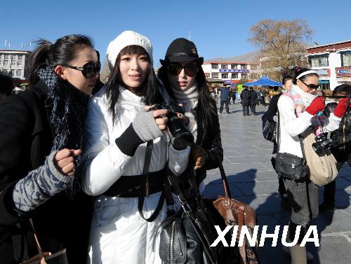 12月4日,几名来自内地的游客在拉萨街头享受冬日的阳光。