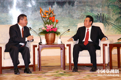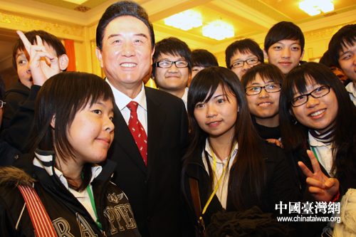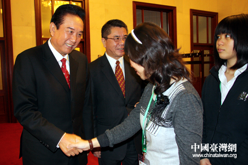 海峡两岸关系协会会长陈云林,25日在北京会见了来京交流的广东东莞台商子弟学校董事长叶宏灯及其率领的该校160多名师生代表。东莞台商子弟学校成立于1997年,是第一所专门为解决台胞子女在大陆就读问题而建立的学校,目前有学生1700多人。(中国台湾网 李徽 摄)