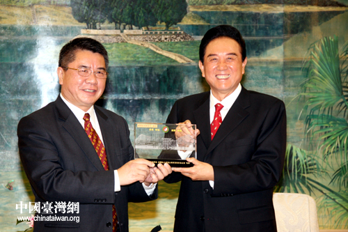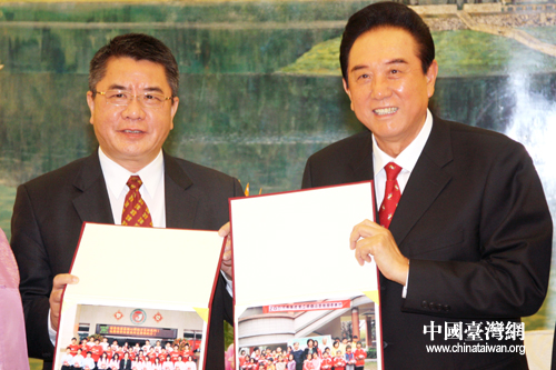 叶宏灯向陈云林赠送印有东莞台商子弟学校校训的礼品(中国台湾网 李徽 摄)