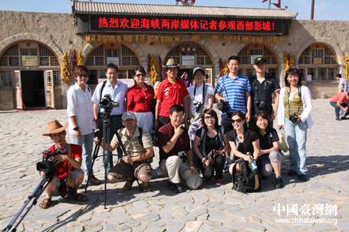 7月25日,海峡两岸的记者在银川镇北堡西部影城合影留念。(中国台湾网 杨永青 摄)