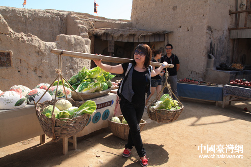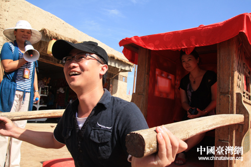 中国台湾网7月26日银川消息 挑菜、抬轿、打铁,举坛畅饮、把酒言欢,模仿著名影视剧中人物造型,两岸媒体宁夏南部行的记者昨日上午在银川镇北堡西部影城畅快游玩,将《红高粱》中张艺谋为巩俐说戏的场景和周星驰在《大话西游》中的经典造型风趣地体现出来。