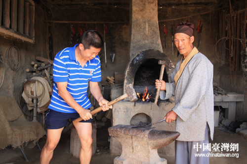 我做事就是这么认真—东南卫视海峡新干线吴明东模仿打铁(中国台湾网 杨永青 摄)
