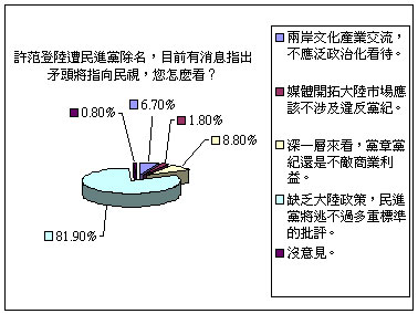 中国台湾网7月29日消息 台湾《中时电子报》最新在线民调“许、范登陆遭民进党除名,目前有消息指出矛头将指向民视,您怎么看?” 至29日上午8点为止,累计投票897票,超过八成参与投票的台湾网友选择“缺乏大陆政策,民进党将逃不过多重标准的批评。”