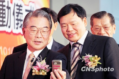 11月24日,中国电子工业标准化技术协会和中国通信标准化协会名誉理事长娄勤俭(右),和台湾金仁宝集团董事长许胜雄(左)等在台北共同按下启动球,宣告台湾威宝电信“TD-SCDMA试验网”正式开通。图为两人在开通仪式中就两岸间第一个TD视频通话交换意见。 中新社发 黄少华 摄