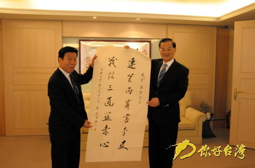 李德强副主席向中国国民党荣誉主席连战赠送山东书法家作品(你好台湾网 图)