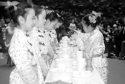 据悉,这是中国闽台缘博物馆开馆以来首次举行的大型品茗活动。在现场,记者看到这里摆上数十张具有闽南特色的八仙茶桌,来自海内外的嘉宾们坐在八仙桌品名茶,观茶艺,话“五缘”,叙乡情。现场名茶飘香,还表演各种节目,有清水祖师文化的禅茶茶艺《清水佑民》,以及葫芦丝独奏、扬琴独奏、茶艺情景书法和闽南答嘴鼓《闽南茶俗》等节目。特别是少儿乌龙茶艺表演的小姑娘们,她们一出场,就成为亮点,赢得阵阵喝彩。