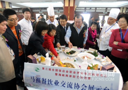 3月18日,台北中华美食交流协会执行长梁幼祥、马祖餐饮交流协会总干事林中超等闽台烹饪美食业界嘉宾在此间展出的马祖餐饮交流协会展示台前观摩交流。