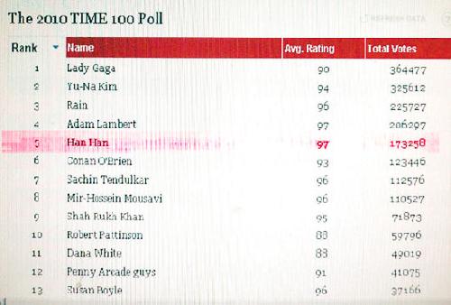 时代周刊2010年“全球最具影响力的人”排行调查,到昨晚七点,韩寒排名第五,得票数十七万三千多张。