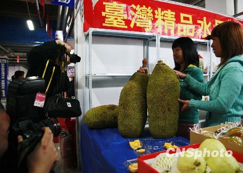 4月26日,在河北正定县小商品博览会上,300个家台企的数千种商品亮相。在台湾展区展销的水果、小食品、饰品、服装等特色商品受到游人欢迎。图为来自宝岛台湾的精品水果“菠萝蜜”其硕大的体形吸引了媒体的眼球。 中新社发 翟羽佳
