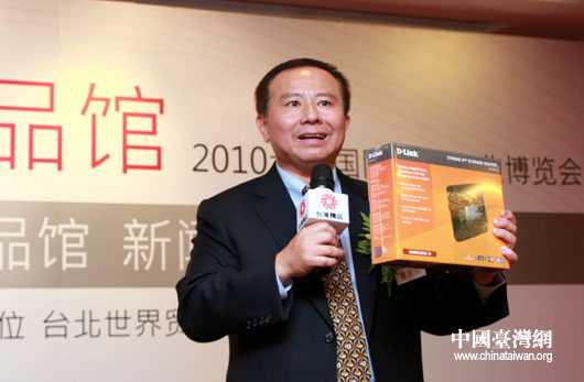 友讯科技公司执行长曹安邦向大家介绍自己公司生产的精品路由器。(中国台湾网 钟宝华 摄)