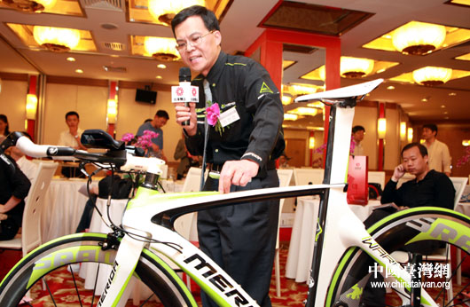 美利达公司总经理许世彦兴致勃勃的讲解自己公司生产的多功能竞赛三铁竞速车。(中国台湾网 钟宝华 摄)
