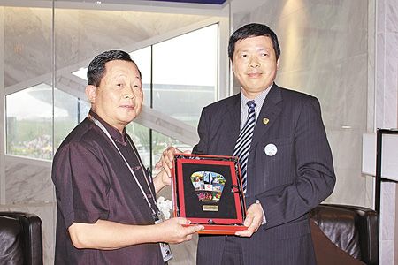 苗栗县长刘政鸿(左)与12位县议员参观上海世博台湾馆,表达买下台湾馆的充分诚意,由总馆长叶明水致赠纪念品,纪念品正是一幅台湾馆天灯纪念徽章拼图组。图片来源:中国时报