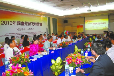 21日上午,适逢台湾茶叶重镇南投县举办“世界茶叶博览会”期间,由福建日报报业集团所属《海峡茶道》杂志社、海峡茶业交流协会和南投县农会等共同举办的闽台茶业高峰论坛在该县中兴会堂举行(如图)。闽台两地茶业知名专家、学者和茶企代表共聚一堂,品茗论道,谈茶缘,谋发展。