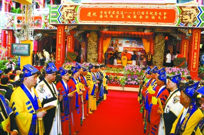 昨日上午,适逢孚佑帝君吕洞宾成道1130周年之际,包括北京、香港、台湾各地在内的海峡两岸三地道教界近千名代表在台北指南宫联合举行祈福大会(上图),中华宗教文化交流协会副会长蒋坚永与台湾知名人士王金平、吕秀莲、郝龙斌等担任主祭官,共同祈愿两岸风调雨顺,和平发展。