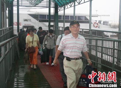 8月31日下午14时许,受热带风暴“狮子山”、“南川”的影响,泉金海域风雨交加,“泉金”航线临时停航。图为随着“泉州轮”在风雨中靠泊石井对台客运码头,当天最后一批旅客23人上岸。(林慧萍 摄)