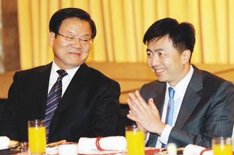 蔡武(左)率团访台参加在台北举办的两岸文化论坛,盛治仁(右)2日晚设宴欢迎。(来源:台湾《联合报》)