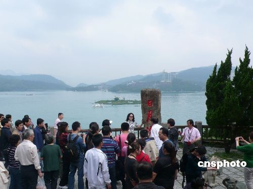 资料图:大陆游客排队在台湾日月潭参观留念。 中新社发 邓敏 摄