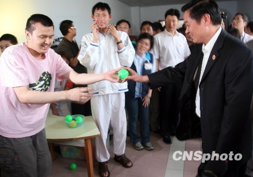 5月27日,参加“天府四川宝岛行”的中共四川省委书记刘奇葆一行,来到阳明教养院参访,传递爱心,与残障人士亲密接触。图为一位残障者正在练习简易投篮,球滚到一侧,刘奇葆连忙俯身捡起,递到残障者手上。 中新社发 邹辉 摄